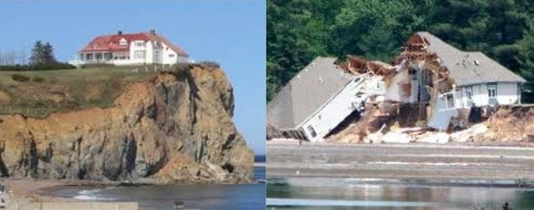 Matthew 7:24-27 – “Therefore everyone who hears these words of Mine and acts on them, may be compared to a wise man who built his house on the rock. 25 “And the rain fell, and the floods came, and the winds blew and slammed against that house; and yet it did not fall, for it had been founded on the rock. 26 “Everyone who hears these words of Mine and does not act on them, will be like a foolish man who built his house on the sand. 27 “The rain fell, and the floods came, and the winds blew and slammed against that house; and it fell — and great was its fall.” NASU