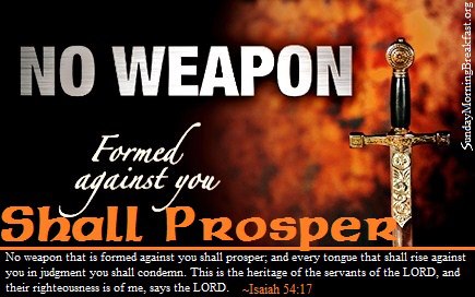 Isaiah 54:17 – “No weapon formed against you shall prosper, and every tongue which rises against you in judgment you shall condemn. This is the heritage of the servants of the LORD, And their righteousness is from Me,” says the LORD.” NKJV
