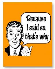 I have a friend who would often say to his children when they questioned something, “…because I said so…”  He felt that it did not matter what he said they should obey his command even if his own actions contradicted that edict.  I have said to my children, “…because I said so…” but never felt that it was sufficient as a standalone statement and felt that due to the immediate or imperativeness of the situation explanation might not be in order and compliance was required but believe that usually a fuller explanation would be beneficial.