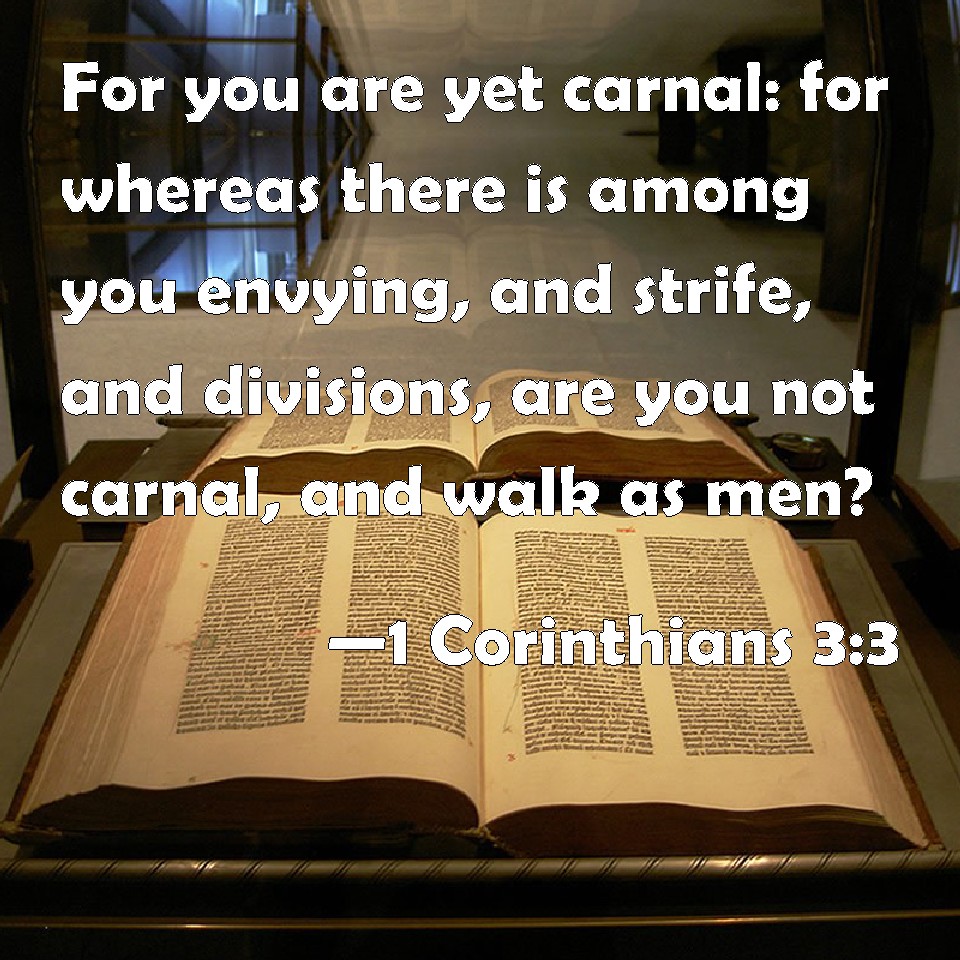 1 Corinthians 3:1-4 – “And I, brethren, could not speak to you as to spiritual people but as to carnal, as to babes in Christ. 2 I fed you with milk and not with solid food; for until now you were not able to receive it, and even now you are still not able; 3 for you are still carnal. For where there are envy, strife, and divisions among you, are you not carnal and behaving like mere men? 4 For when one says, “I am of Paul,” and another, “I am of Apollos,” are you not carnal?” NKJV