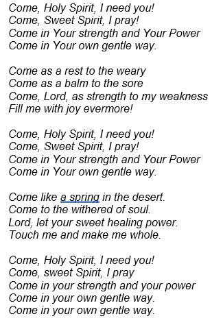 My prayer is, “Lord, fill me to overflowing; saturate Me with the Spirit of God.” I love the chorus or song, “Come Holy Spirit.”